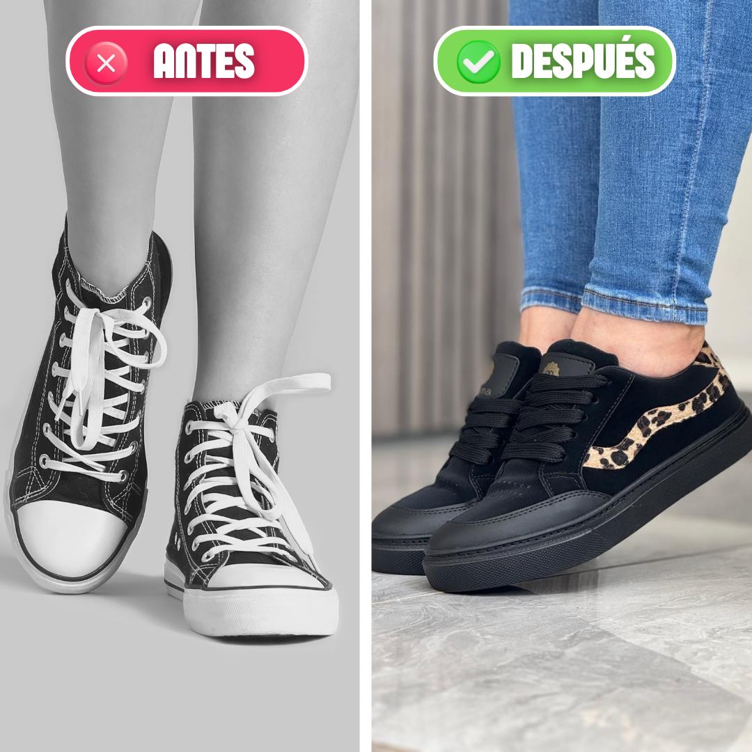 Atrévete a marcar estilo con los WildStep™, tenis negros elegantes y versátiles que destacan con un detalle en animal print para un look urbano y atrevido.